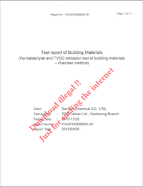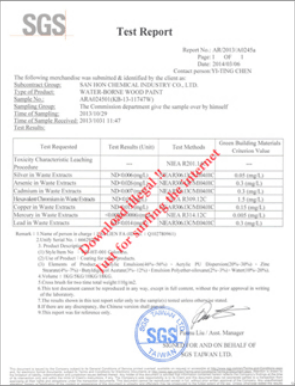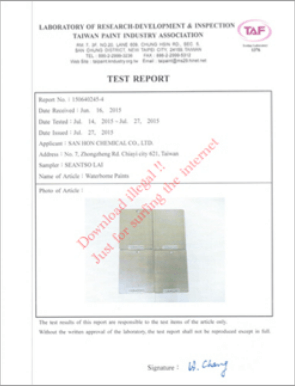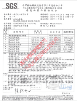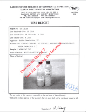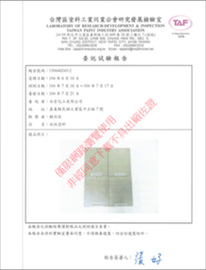 生產高品質、省能源、無公害,兼具功能 和機能性的材料,無論在工業用或手工用 都可以滿足美學要求,增加產品的附加價 值、延長使用年限、易施做,這是我們開 發的目標,我們致力於開發製造耗用原料 最省,可迴圈使用的水性系統塗料,茲列 我們產品檢測報告於下: